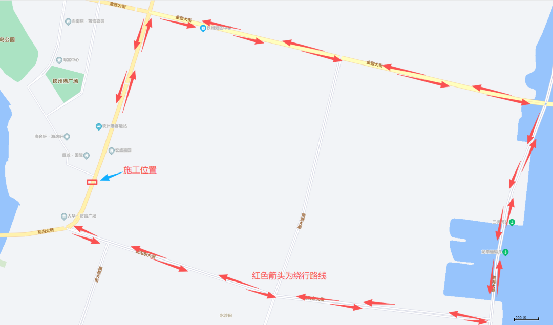 需要通过钦州港大道往勒沟作业场区的车辆,请绕行金鼓大街、临海大道、勒沟东大街等路段通行。