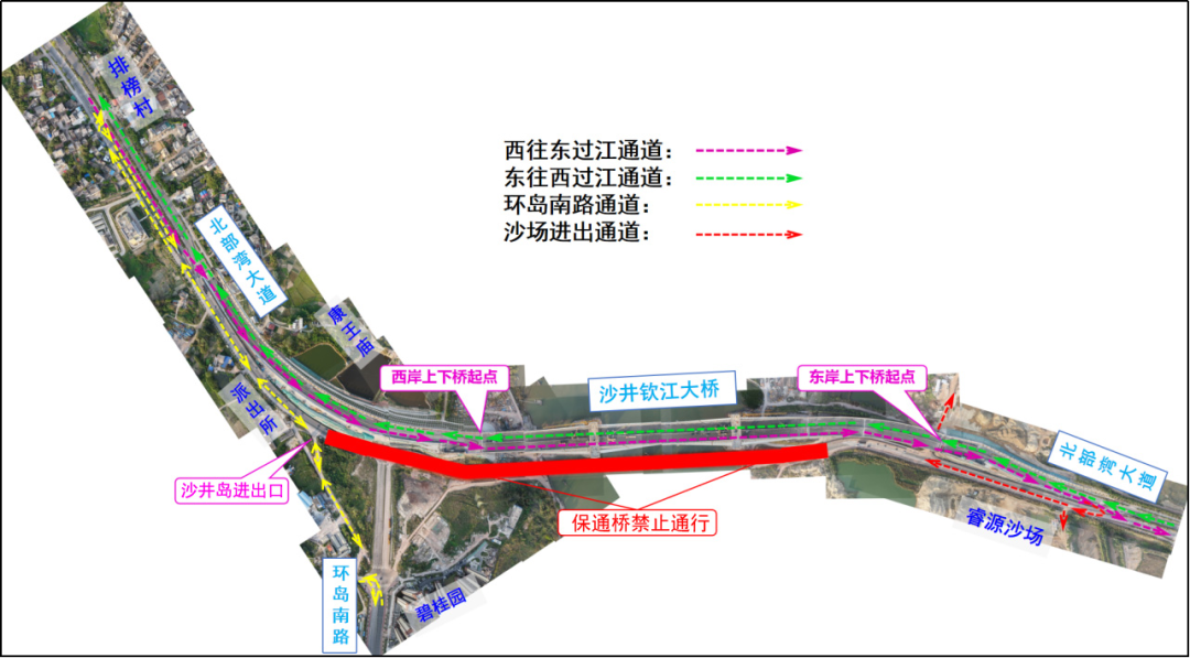 (三)绕行提示:环岛南路(沙井岛片区)车辆及行人通过北部湾大道辅道通行,在排榜村处附近进出辅道。