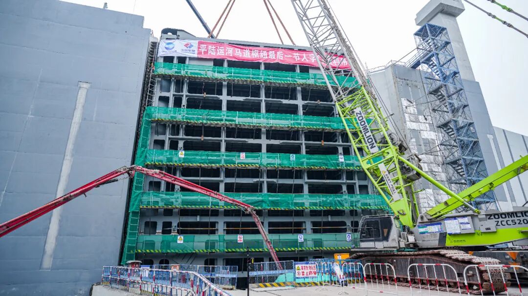 12月5日,平陆运河马道枢纽上闸首左线最后一节人字门精准吊装落位,标志着平陆运河枢纽工程船闸人字门吊装工作全部完成,全面转入人字门附件及机电设备安装新阶段,为有序推进无水调试、有水调试奠定坚实基础。