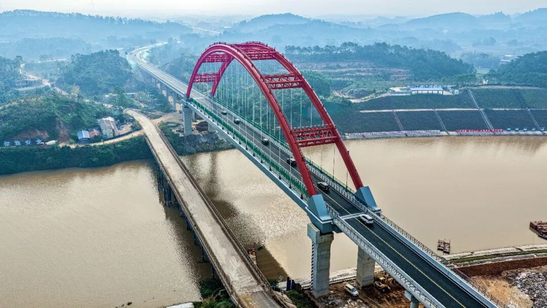 此次通车的两座桥梁,虽定位不同却同样承载着民生期盼。其中,丁屋村大桥位于钦州市以北约23公里的久隆镇附近,为原位重建项目,是省道S313跨越钦江的重要交通枢纽。桥梁全长932.08米,主桥为175米下承式钢管混凝土系杆拱,拱肋采用哑铃型断面设计;桥面总宽12米,两侧配套设置人行道,采用双向两车道二级公路标准建设,设计时速60公里/小时,将成为串联区域主干道、保障群众快速通行的关键节点。与之相邻的相思大桥,坐落于久隆镇黎屋村与平吉镇相思坪村交界处,为异位重建项目,聚焦乡村互联互通需求,是连接相邻村镇、畅通“最后一公里”的民生桥梁。该桥全长992.08米,主桥同样采用175米下承式钢管混凝土系杆拱结构,桥面总宽12米并配套人行道,采用双向两车道四级公路标准,设计时速20公里,精准匹配村镇间日常通行需求,将彻底改善沿线村民跨江出行的不便。自2023年11月同步开工以来,平陆运河建设管理团队秉持“民生优先、施工有序”理念,攻克工点分散、高空作业风险高、吊装场地受限等多重挑战。通过采用装配式支架整体安装、鹰嘴吊架导向提吊等创新工艺,结合智能摊铺技术,保障了施工安全与品质,最终实现两桥同步通车,以技术创新兑现民生承诺。未来,随着平陆运河沿线交通网络的持续完善,更多便捷高效的交通红利将不断释放,既为区域高质量发展注入强劲动力,也为民生福祉提升筑牢坚实根基。