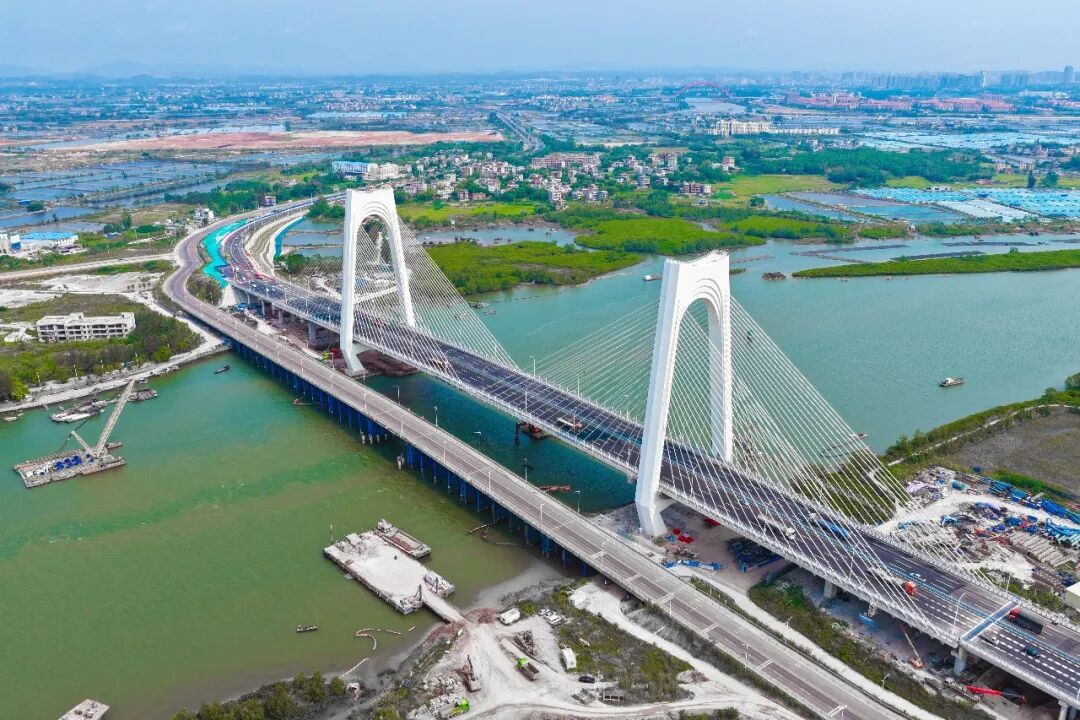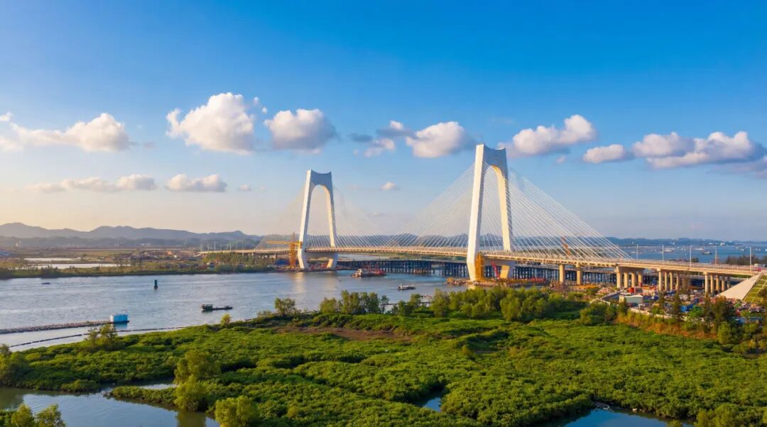 平陆运河沙井钦江大桥地处钦江入海口,潮汐条件复杂,且紧邻红树林生态保护区,项目建设过程中面临生态保护、水文影响、工期管控等多重挑战。为统筹应对航道与桥梁交叉施工带来的影响,新建桥梁主梁采用“挂篮悬臂浇筑+落地支架现浇”组合工艺,所有大型临时设施均不占用临时航道及永久航道,既保障航道通行不受施工干扰,又可在航道标段开展桥梁压占区开挖作业时,按期移交施工工作面。施工过程中,平陆运河建设管理团队突破传统工序限制,优化应用“混凝土结构门型索塔箱梁斜拉桥塔梁同步施工工法”,构建“实时监测+动态调整”一体化管控体系,通过强化结构锚固、精细化管控梁段施工等技术手段,成功攻克多项核心技术难题,保障沙井钦江大桥如期建成。截至目前,平陆运河规划的27座跨线桥梁中,已有25座桥梁建成通车,全线桥梁工程即将收官,为平陆运河全线通航奠定了坚实基础。