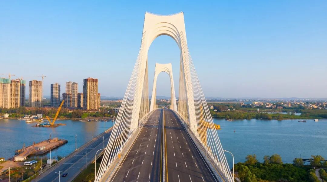 平陆运河沙井钦江大桥采用双塔斜拉桥设计,主塔采用“门”式索塔,塔柱高113米。桥塔上横梁整体造型抽象于巨轮出海激起的滔滔波浪,打造出扬帆远航的“门户”形象,并巧妙融合了“大门”与“醒狮”的双重文化意象,在现代工程的简洁线条中,生动注入了吉祥兴旺的岭南意蕴。该桥全长896米、主跨270米,大桥设计时速60公里,桥面宽40米,采用双向8车道,结构安全等级一级,通航净高19.1米、通航净宽234米,可满足运河5000吨级船舶安全通航需求。